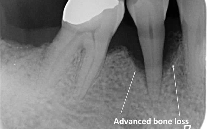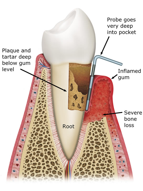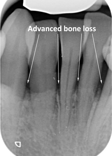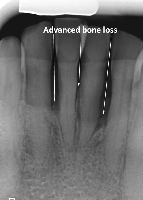Periodontitis is a more advanced stage of gum disease where there has been damage to the bone which supports the teeth. If left untreated periodontitis leads to more and more bone loss until the teeth start to become loose and eventually fall out by themselves or need to be extracted by a Dentist.