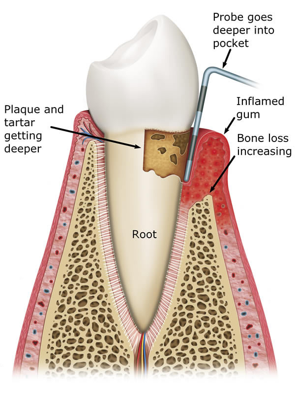 The main cause of gum disease is plaque. Plaque consists of millions of bacteria which live on and around the teeth and gums. These bacteria produce toxins which damage the gums. To begin with the gums start to peel away from the teeth and “pockets” form. As the bacteria penetrate deeper into these “pockets” they then start to cause damage to the bone which holds the teeth in. As more bone loss occurs the teeth start to become increasingly looser until they eventually start to fall out one by one.